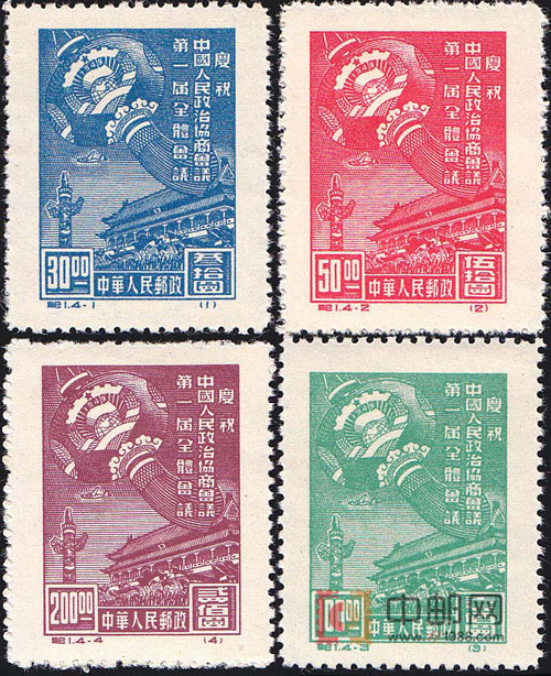 为了庆祝中国人民政治协商会议第一届全体会议胜利召开,我国华北邮政总局以“中华人民邮政”名义,发行了这套邮票,这是新中国成立后发行的第一套纪念邮票。由于建国之初,东北地区流通的币值尚未用人民币收兑,因此,另发行同图东北币值邮票。并于1955年1月10日再版。全套4枚邮票图案相同,均为天安门前人流如潮,热烈欢庆;天安门上宫灯高悬,迎风飘舞,灯面上那枚硕大的人民政协会徽分外醒目,充分表现出会议的庄严,拉开了新中国辉煌灿烂的序幕。