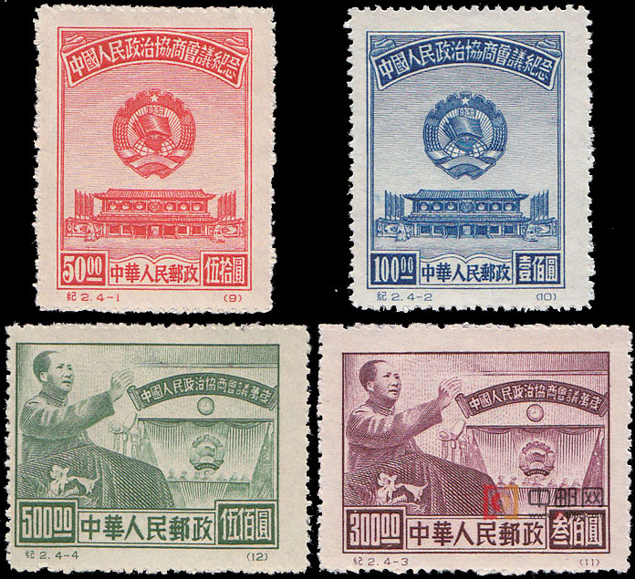 中国人民政治协商会议是中国人民爱国统一战线的组织,在中华人民共和国成立前夕,由中国共产党、各民主党派和无党派爱国人士、各人民团体共同创立。会议于1949年9月21日至30日在北平中南海怀仁堂举行。大会通过了作为临时宪法的《中国人民政治协商会议共同纲领》、《中国人民政治协商会议组织法》以及《中国人民政治协商会议第一届全体会议宣言》,会议选举了以毛泽东为首的中央人民政府,决定中华人民共和国定都北平,并将北平改名北京;决定五星红旗为中华人民共和国国旗,《义勇军进行曲》为代国歌;采用公元纪年。中国历史由此掀开了崭新的一页。本套邮票共4枚。4-1、4-2邮票的画面是新华门及中国人民政治协商会议会徽。新华门是中南海的正门。中华人民共和国成立后,中央人民政府和中国共产党中央委员会在这里办公,新华门亦成为中国政治权力的一个象征。