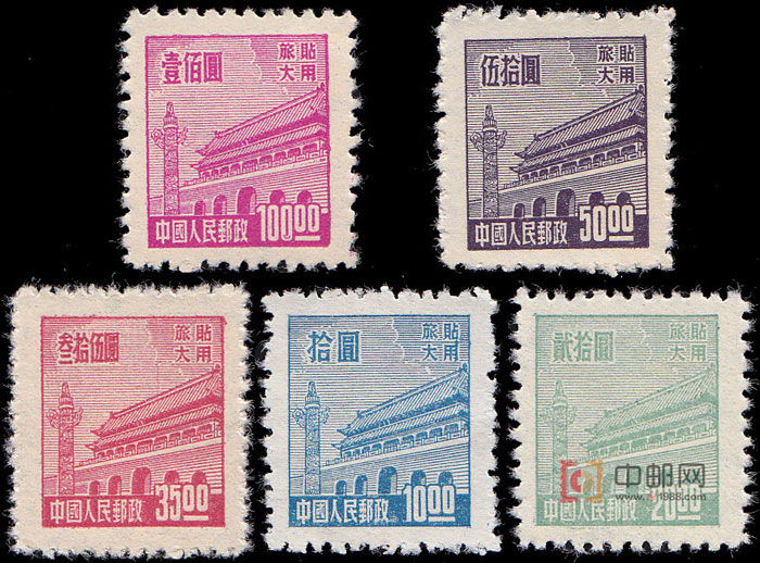 在发行普1邮票时,还分别发行了普1东(限东北贴用)和普1旅(旅大贴用)两套限地方贴用的普通邮票,其中普1东的面值标注与普1相同,但普1旅除面值币制单位不同,为当时旅大地方币值外,在小写面值标注上也有所不同,即小写面值后面还标注有元以后的小数“00”,由于没有用小点,因而采用了字号小于基数币值元加以区分,这在新中国邮票面值的标注上还是很有特色的。