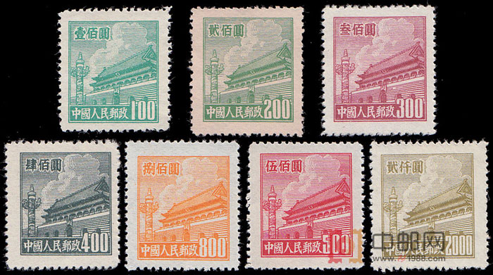 这套邮票天安门上空的白云为一大朵,与“普1”、“普2”不同,组成天空的线条较细密。自这套邮票开始,天安门挂上了毛主席像。