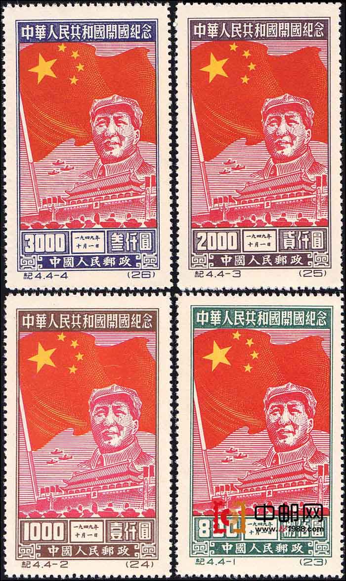 1949年10月1日,中华人民共和国宣告成立,标志着中国新民主主义革命的基本结束,一个崭新的社会主义新时代已经开始。从此中国各族人民在中国共产党领导下开始自己当家作主,为建设一个繁荣富强的社会主义国家而努力奋斗。占人类近四分之一的中国人民的胜利,极大地鼓舞了世界各国人民争取民族独立和社会进步的斗争。为纪念这一伟大的历史事件,自1949年北平解放之后,便积极着手筹备人民政协第一届全体会议和中华人民共和国成立两套纪念邮票的发行工作。但因后来对图稿多次修改,如票型由横版改为竖版;“中华人民邮政”改为“中国人民邮政”;由于邮资的调整,使这套邮票从选题、设计、印制直到发行,将近1年,迟至1950年建党纪念日才问世。全套4枚邮票,图案相同。庄严的五星红旗第一次在中国邮票上出现。毛泽东主席,宏伟的天安门以及接受检阅的人民解放军的坦克、飞机,都形象地记录了新中国开国盛典的这一伟大的历史时刻。亦发行了东北贴用套票,并于1955年1月10日再版。