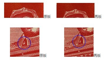 如上图所示,纪4原版(左)和再版票(右)可以从钮扣上的纹路和“纪4”后的点加以辨认(再版的“.”比原版的大且清晰)。另外还可以通过齿孔度数来区分纪4的原版和再版:原版为P14,再版为P12.5。