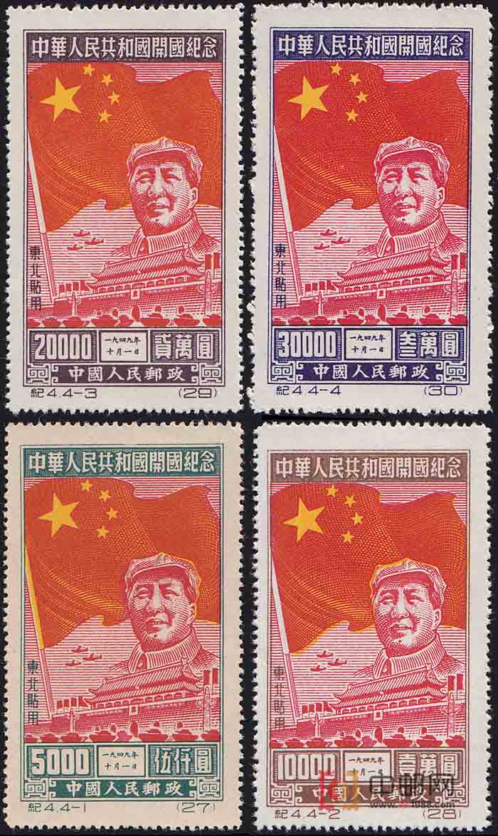 1949年10月1日,中华人民共和国宣告成立,标志着中国新民主主义革命的基本结束,一个崭新的社会主义新时代已经开始。从此中国各族人民在中国共产党领导下开始自己当家作主,为建设一个繁荣富强的社会主义国家而努力奋斗。占人类近四分之一的中国人民的胜利,极大地鼓舞了世界各国人民争取民族独立和社会进步的斗争。为纪念这一伟大的历史事件,自1949年北平解放之后,便积极着手筹备人民政协第一届全体会议和中华人民共和国成立两套纪念邮票的发行工作。但因后来对图稿多次修改,如票型由横版改为竖版;“中华人民邮政”改为“中国人民邮政”;由于邮资的调整,使这套邮票从选题、设计、印制直到发行,将近1年,迟至1950年建党纪念日才问世。全套4枚邮票,图案相同。庄严的五星红旗第一次在中国邮票上出现。毛泽东主席,宏伟的天安门以及接受检阅的人民解放军的坦克、飞机,都形象地记录了新中国开国盛典的这一伟大的历史时刻。亦发行了东北贴用套票,并于1955年1月10日再版。