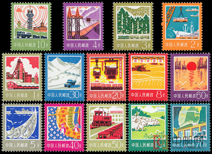 第8图:邮电,10分,主图为邮电通信设施。 a. 宽距。主图下边框与“10”之间的距离较宽(再版)。