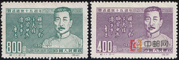 1936年10月19日,鲁迅因肺病,在上海与世长辞,享年56岁。巨星陨落一十五载。为了纪念他,邮电部发行了这套《鲁迅逝世十五周年》纪念邮票。全套2枚,画面相同,均为鲁迅半身画像及诗句:“横眉冷对千夫指,食道甘为孺子牛。”这两句话,源自1932年10月12日鲁迅写给著名爱国人士柳亚子先生的一首小诗,题为《自嘲》,全文:“运交华盖欲何求,未敢翻身已碰头。破帽遮颜过闹市,漏船载酒泛中流。横眉冷对千夫指,俯首甘为孺子牛。躲进小楼成一统,管他冬夏与春秋。”这首诗写在中国最为黑暗的年代,面对外部日本帝国主义的疯狂侵略和内部国民党反动派残酷压迫及文化“围剿”,鲁迅以幽然的笔调和自嘲的口吻,描述了自己深受迫害的险恶处境,抒发了顽强的斗志和乐观的豪情。这套邮票亦于1955年1月10日再版。