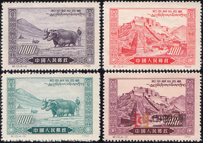1949年10月1日,中华人民共和国和中央人民政府宣告成立。在中国人民革命胜利的鼓舞和中央人民政府民族政策的感召下,西藏和其他地区的藏族爱国同胞迫切要求中央人民政府解放西藏,并为和平解放西藏奔走呼吁。1951年5月23日,中央人民政府和西藏地方政府关于和平解放西藏办法协议的签字,宣告西藏和平解放。为祝贺和平解放西藏,邮电部发行了这套纪念邮票。共4枚两种图案。并于1955年1月10日再版。