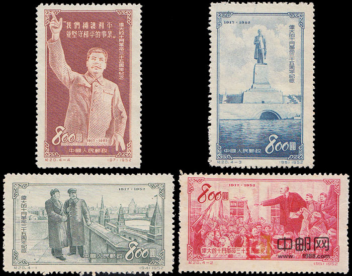 1917年爆发的俄国十月革命是俄国工人阶级在布尔什维克党领导下联合贫农所完成的伟大的社会主义革命。这次革命在人类历史上第一次推翻剥削阶级的统治,建立了苏维埃社会主义国家,它开辟了人类历史的新纪元。这次革命发生在1917年11月7日,按俄历为10月25日,因此称之为“十月革命”。在十月革命35周年之际,邮电部发行了这套纪念邮票。这套邮票曾定于1953年2月14日发行,名称为:“伟大的苏联十月革命三十五周年纪念”,但“苏联”乃1922年才成立,十月革命时的1917年尚无“苏联”,因此停发。4月23日重印,名称删去了“苏联”二字,10月5日发行。