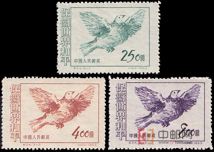 1952年12月12日至20日,世界人民和平大会在奥地利首都维也纳举行,这次大会是由1952年7月举行的世界和平理事会柏林特别会议决定召开的。出席大会的有85个国家的正式代表、观察员和来宾等1904人。大会主要讨论了民族独立和国际安全问题:停止一切现有战争,特别是朝鲜战争问题;缓和国际紧张局势问题,并分别作出有关的决议。大会最后通过《世界人民和平大会宣言》和《致五大国政府书》。并呼吁美国、苏联、中国、英国、法国五大国立即协商缔结和平公约,大会制订了争取和平的共同纲领,推动了世界和平运动进一步发展。为了表达中国政府和人民维护世界和平的愿望,邮电部再次发行《保卫世界和平》(第三组)纪念邮票。3幅画面,图案相同,均为毕加索为和平事业而精心绘成的鸽子。
