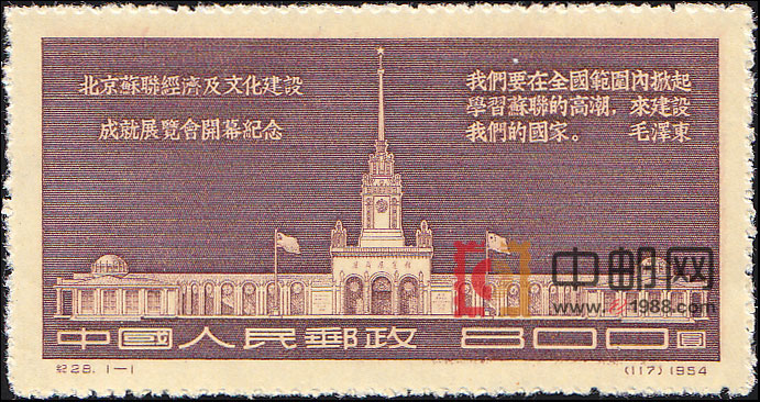 1954年10月2日,为了展示苏联经济和文化建设的辉煌成果,在北京举办《苏联经济及文化建设成就展览会》,展出期间,先后有276万人前去参观,受到很大的鼓舞和激励。10月25日,毛泽东等党和国家领导人,亲去参观并题词。为了纪念这次盛大的展出,邮电部发行了这套邮票。主图为展览馆建筑外景及“北京苏联经济及文化建设成就展览会开幕纪念”字样和毛泽东的题词:“我们要在全国范围内掀起学习苏联的高潮,来建设我们的国家。”