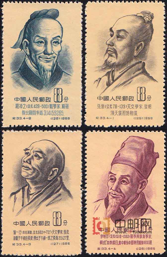 本套邮票为纪念天文学家张衡、数学家祖冲之、天文学家僧一行和医学与药物学家李时珍而发行。