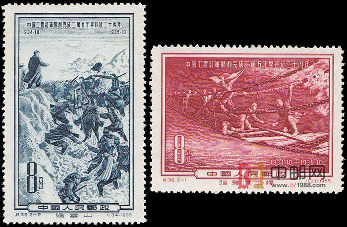 1933年9月,蒋介石调集100万军队向红军发动第五次“围剿”,部署进攻中央根据地的兵力有50万。此时,全国红军虽已发展到30万,红一方面军也发展到近10万人。但是,“左”倾冒险主义者根本否认敌强我弱这个基本事实,完全听从当年9月到中央苏区来的共产国际军事顾问李德的错误主张,使红军遭受重大损失,最后不得不和苏维埃共和国一同退出中央革命根据地,进行战略大转移。1934年10月,中央工农红军8万多人撤离中央根据地,开始了举世闻名的长征。1936年10月,红军一、二、四方面军终于在甘肃会宁、静宁地区胜利会师,至此,全国主力红军的长征宣告结束。为纪念红军长征胜利完成20周年,邮电部发行了这套邮票。以2幅典型画面展示了红军长征的伟大、悲壮和艰苦。