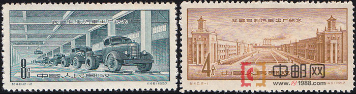 中华人民共和国政府把制造自己的汽车列为建国后的重点工程。1956年10月1日,中国自行设计制造的“解放牌”汽车首次出现在国庆节游行队列中。为了纪念中国自制汽车出厂,中国邮电部于1957年5月1日发行了一套纪念邮票。