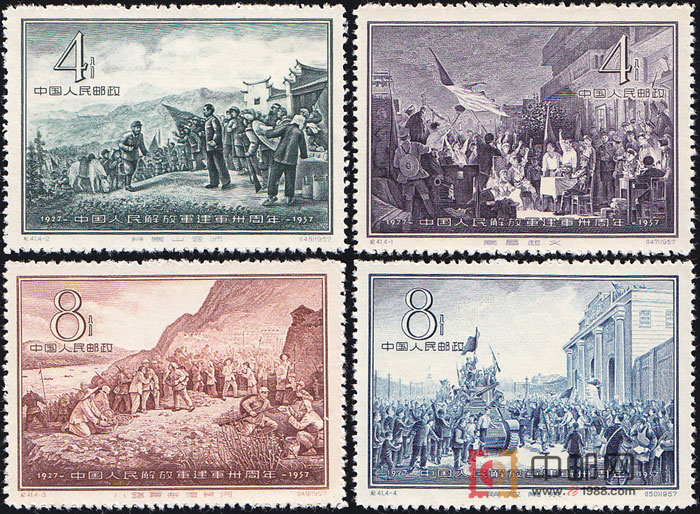 在中国人民解放军建军30周年之际,邮电部发行了这套纪念邮票。全套邮票以油画原画为依据进行设计。选取了土地革命战争时期、抗日战争时期和解放战争时期的4幅典型历史画面,([南昌起义]、[井冈山会师]、[八路军东渡黄河]、[解放南京])概括地描述了中国人民解放军的成立发展、成长壮大的过程。