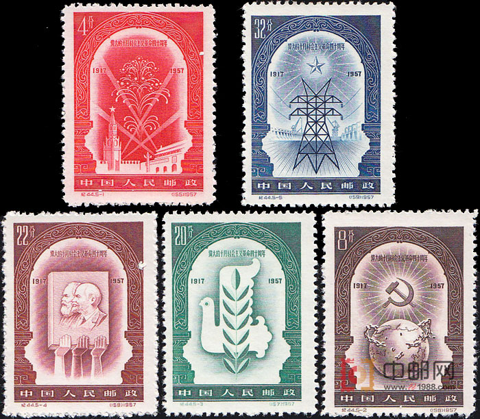 本套邮票共5枚。5-1为“庆祝节日”,主图是:在圆形的拱门下,右边是天安门,左边是克里姆林宫。从两座建筑物上,射出探照灯的光柱,在探照灯交叉的地方,升起了礼花。
