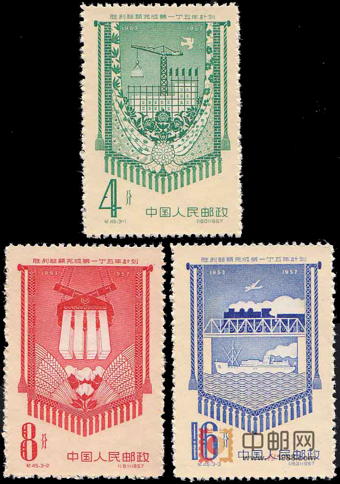 中国第一个五年计划偏重于经济建设,特别是工业、农业和交通运输。本套三枚邮票的图案即反映出这一特点。3-1为“和平建设”,邮票图案是绿色背景和一只和平鸽,中间是大吊车和正在兴建的建筑物,反映了和平建设的主题。3-2为“工业和农业”,图案是红色背景下麦穗托着刚用吊车吊起的钢条,表示中国工业和农业生产的发展。3-3为“交通运输”,图案是飞机在蓝天飞翔,火车在跨越大桥,桥下呜着汽笛的轮船在航行,表现中国交通运输业蒸蒸日上。