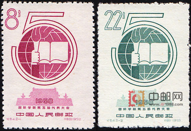 国际学联的全称是国际学生联合会,成立于1946年。1958年9月4日至15日,国际学联第五届代表大会在我国首都北京召开。70个国家和地区的200多名代表和观察员参加了会议。大会主要讨论了国际学生运动的发展,以及国际学联和学生组织对保卫学生利益和促进学生合作的贡献等问题,标志着世界学生进一步大团结。为祝贺这次大会的召开,邮电部发行了这套邮票。2幅画面图案相同。邮票下方绘有淡淡的天安门剪影,并有“1958”及上部的阿拉伯数字“5”字样,表明了会议召开的时间、地点及届数。而主图则为国际学联的会徽,其图案为一手高举着熊熊燃烧的火炬,照亮了一本打开在地球上的书,完美地体现了国际学联致力于维护世界和平和争取民主教育的宗旨。这套邮票原定1958年9月1日发行,因票名误为:“第五届世界学生代表大会”而停发。经改正后,于会议开幕之日正式发行。