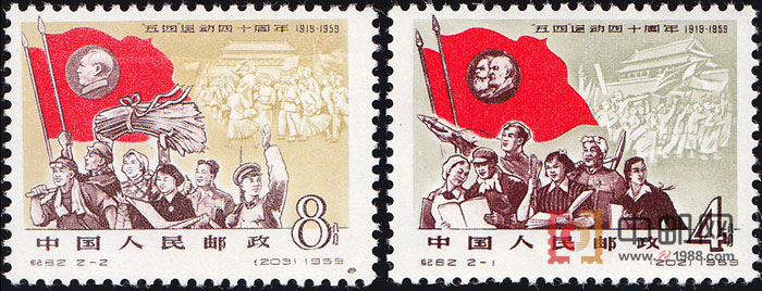 “五四”运动是中国人民反对帝国主义和封建主义的伟大革命运动,1939年,陕甘宁地区西北青年救国联合会决定,将五月四日定为中国青年节。中华人民共和国成立以后,中央人民政府政务院在1949年12月正式宣布以5月4日为中国青年节。值此伟大的“五四”运动40周年之际,邮电部发行了这套纪念邮票。2幅画面均依据我国著名画家周令钊的一幅油画进行设计。表现在马列主义的旗帜下,工农商学兵发扬五四精神,继承五四传统,胜利前进的姿态。