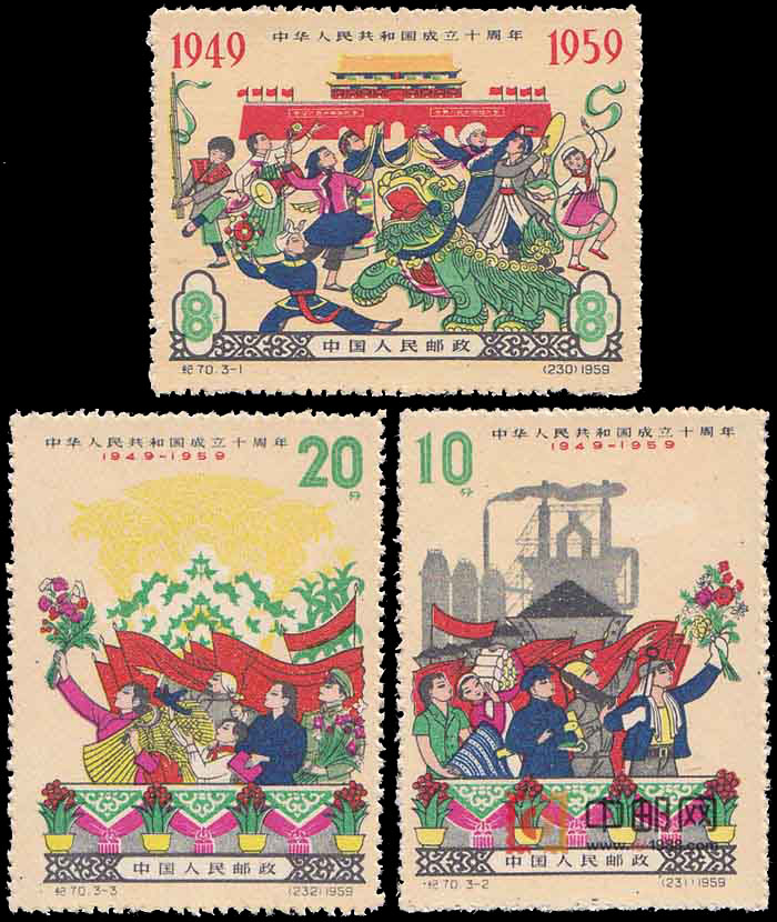 这套建国10周年系列邮票第四组,在3幅邮票画面的设计上,运用了民族传统艺术形式,以渲染喜庆的气氛。第1图描绘全国各族人民在天安门广场上载歌载舞、热烈欢庆的场面,第2图描绘了一队工人手持鲜花和工业产品热烈欢庆的场面,第3图农民和解放军战士、知识分子和少先队员手持鲜花和农产品热烈欢庆的场面。
