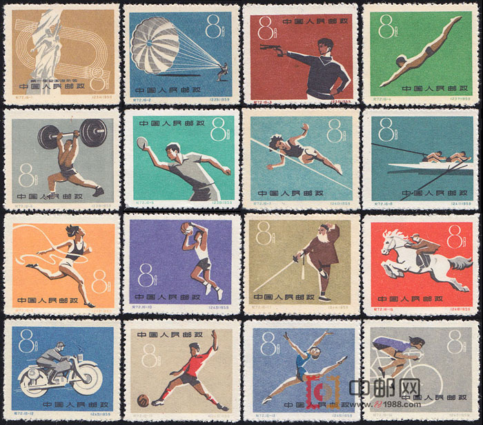 本套邮票共16枚。16-1为“运动场”,由运动员雕像与跑道背景构成。其他15枚分别为“跳伞”、 “射击”、“游泳”、“乒乓球”、“举重”、 “跳高”、“划船”、 “径赛”、“篮球”、 “武术”、 “摩托车”、“体操”、“自行车”、“赛马”和“足球”。每一幅画面上有一位处于动态中的运动员。整套邮票展现出中国运动员奋发努力的精神风貌和中国发展体育事业的勃勃雄心。