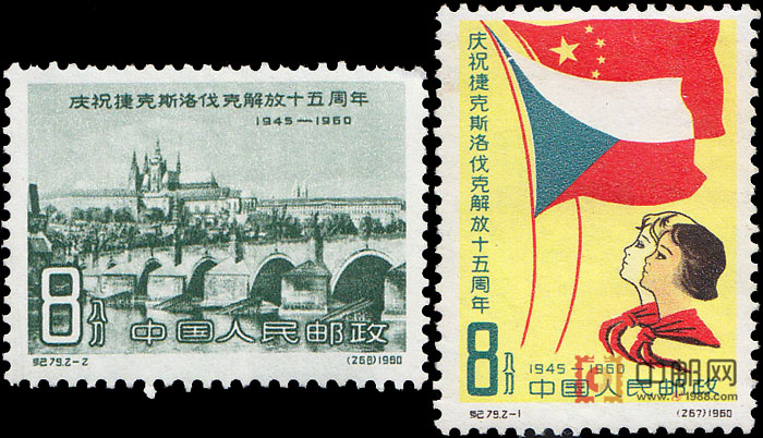 2-1为“友好团结”。画面为头戴红领巾的中国和捷克斯洛伐克两位少先队员抬头仰望随风飘扬的中、捷两国国旗。