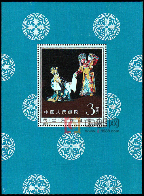 1965年9月15日发行,由吴建坤设计,面值3元,采用的是剧照《贵妃醉酒》。梅兰芳在此戏中,把两只水袖抖拂得大方自如,不仅表现了杨贵妃雍容华贵, 连长吁短叹、自怨自艾也在水袖上流露无遗,表现出高超的技艺,小型张仅发行2万枚。梅兰芳的精湛表演艺术和邮票传神的设计,加之存世量甚少,使梅兰芳舞台艺术邮票和小型张身份百倍, 成为广大邮迷追寻的珍邮之一。