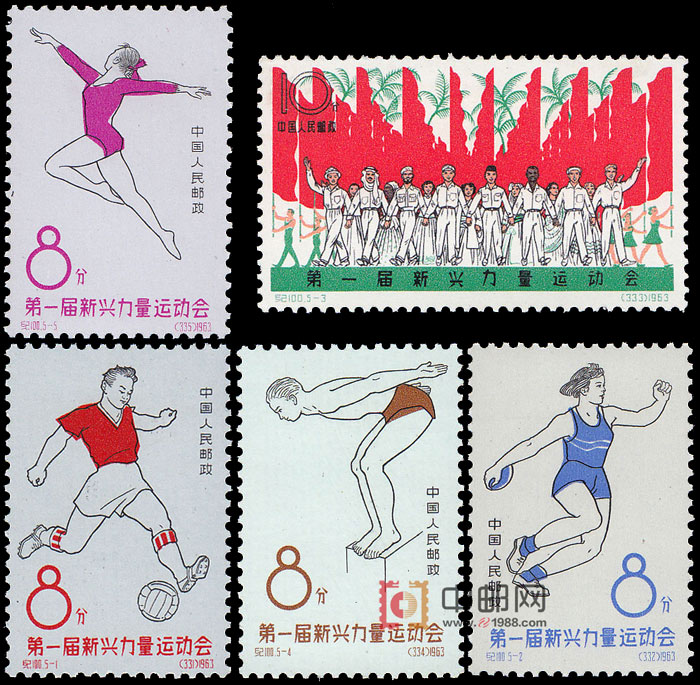 新兴力量运动会,简称“新运会”,是万隆亚非会议精神在国际体育运动在国际体育运动方面的具体表现。第一届新运会于1963年11月10日至22日,在印尼首都雅加达举行。经过比赛,这届运动会打破了一批世界纪录,显示了新兴力量正在成长。运动会圆满闭幕后,于11月24日至25日,在雅加达又召开了新运会代表会议,正式成立了新兴力量运动会联合会,以便组织和联合发展中国家的人民和运动员,抑制帝国主义和殖民主义对国际体育运动的垄断、控制和干涉,有力地推动和促进了新兴力量领土的开展。这套纪念邮票以5幅画面描绘了新兴力量体育运动的盛况。