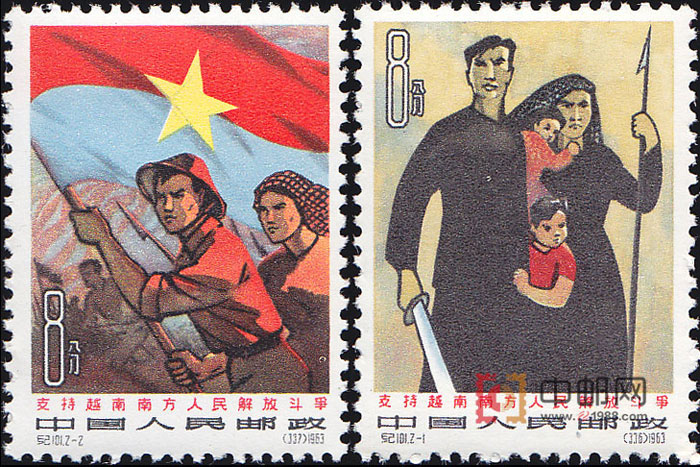 1963年12月20日是越南南方民族解放阵线成立三周年纪念日,同时也是“国际支援南越工人和人民斗争日”。这一天,中国各人民团体和北京各界人民举行集会,支持南越工人和人民的反美斗争。同日,广州等城市也举行了类似的群众集会。中国邮电部接受了中华全国总工会的建议,于当日向全国发行了一套“支持越南南方人民解放斗争”的邮票。
