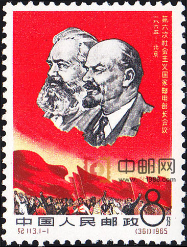 本套邮票共1枚,题为“在马克思、列宁主义旗帜下前进”。主图是马克思和列宁的头像。头像以木刻的艺术手法进行处理,线条刚健有力,使得人物轮廓分明,神态生动逼真。背景全部是红色的大块色调,它覆盖了整个邮票上面的大半部分,使人物形象更为突出。画面的下部是各国人民和无数面飘扬的红旗。