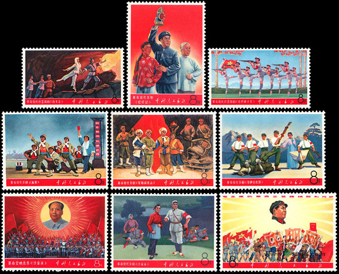 1967年5月9日至6月15日,在北京演出了京剧《智取威虎山》、《红灯记》《海港》等8个现代戏已经篡夺了宣传、文化大权的江青,大言不惭,“钦定”为“样板戏”,统统占为己有当作她自己的政治资本。江青一伙的所谓“文艺革命”,实质上是文化专制。文革期间,为宣传毛泽东革命文艺路线的胜利,邮电部发行了这套革命样板戏邮票。