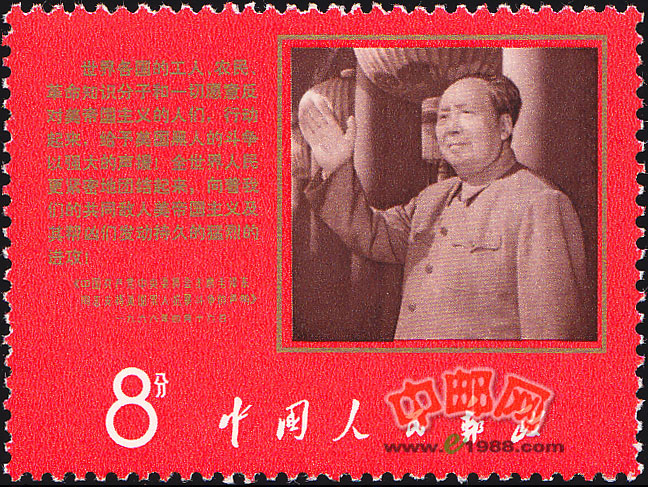 本套邮票共1枚。邮票图案是毛泽东像和《声明》摘录。毛泽东站在天安门城楼上,向群众挥手致意。他身穿银灰色的呢制中山装,身姿魁梧挺拔,脸上神采照人,目光深邃而锐利,充满了自信和洞察力,嘴角微徽带着安祥宁静的笑意,挥动的大手坚定有力、从容稳健。画面突出了他的领袖气质和魅力。总之,这是一幅照得十分成功的领袖像。