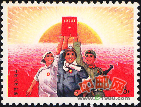 这枚邮票的图案属于宣传画,它明显带有“文化大革命”时期的邮票创作特点,以大红为主,显得十分浓烈。