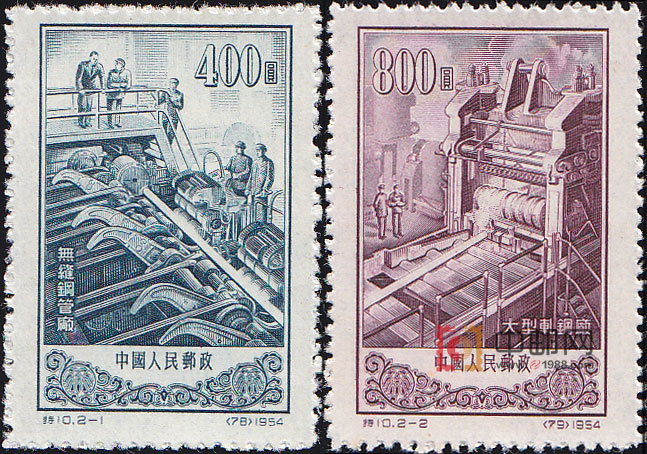 鞍山钢铁公司的无缝钢管厂和大型轧钢厂,是在苏联帮助下,经过中国技术人员和广大干部、工人的共同努力,于1953年12月26日,建成开工投产。这两个工厂的建成,标志着我国的钢铁冶金及机械制造工业,已进入了崭新的发展阶段。在建国5周年之际,邮电部发行了这套特种邮票。第1图为鞍钢无缝钢管厂的生产景象,第2图为鞍钢大型轧钢厂正在进行轧钢的场面。