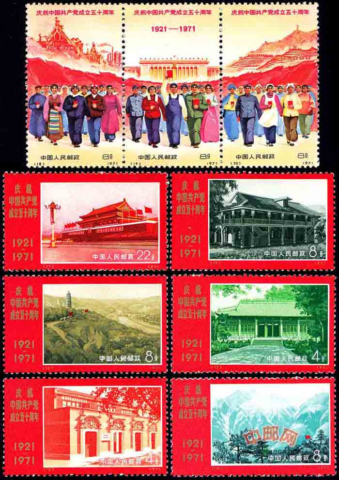 为庆祝中国共产党成立50周年,交通部邮政总局发行了这套纪念邮票。这套邮票除重点表现革命纪念地外,还突出了以工农兵为主的“全国各族人民高举毛泽东思想伟大红旗奋勇前进”的场面。革命纪念地共6枚,其余3枚以表现“高举毛泽东思想伟大红旗奋勇前进”的主题。