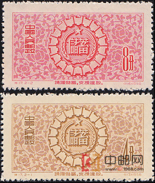 本套邮票共2枚。邮票图案相同,均以人民储蓄徽志作主题,用牡丹花作底纹,象征国家和人民日益走向繁荣幸福。储蓄徽志的结构是:外围以中国古代钱币组成齿轮形状,同中心的“储蓄”两字相呼应,象征把社会资金聚集起来支援国家工业化建设。这些古币集结起来,在内层又形成一道齿轮,同中间的麦穗相结合,象征工农业的发展。正上方五角星象征中国共产党在国家建设中的领导作用。画面除了储蓄徽和牡丹花底纹外,没有其它图饰,使储蓄徽鲜明突出,画面也显得更为简洁。