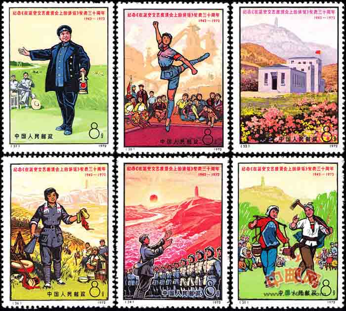 1972年5月23日,为了纪念毛丶泽东同志的《在延安文艺座谈会上的讲话》发表30周年,中华人民共和国交通部发行一套《纪念(在延安文艺座谈会上的讲话)发表三十周年》编号邮票,全套6枚。
