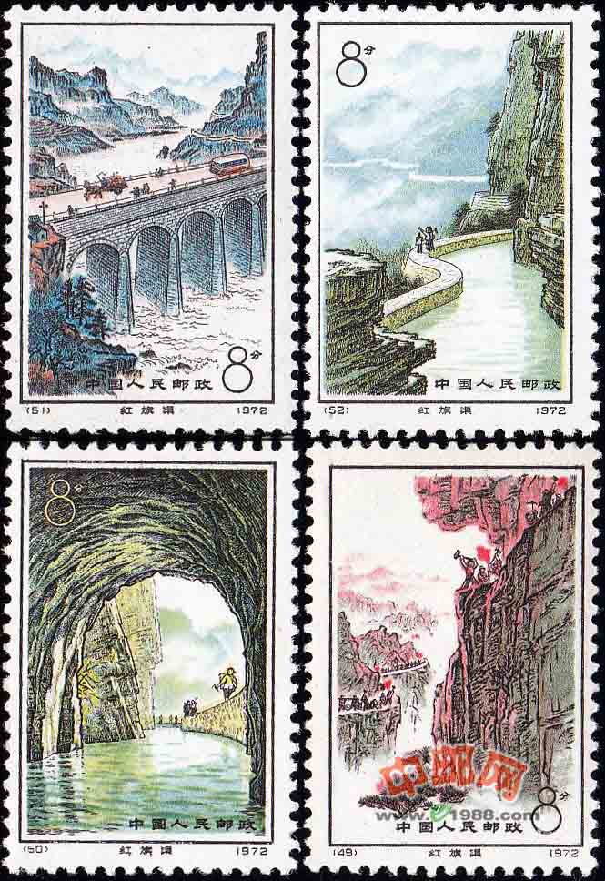 红旗渠使河南林县人民兴修的灌溉工程,以前这里一直是“十年久旱,水贵如油”的穷山村,从1960年起,林县人民用简陋的钢钎、铁锤、炸药,像蚂蚁般山,“愚公”担山一样苦干十年,终于修成了举世闻名的“渠网纵横,清水畅流”的引水工程。为了广泛宣传河南林县人民改造自然,兴修水利的战天斗地艰苦创业精神,交通部邮政总局发行了这套邮票。