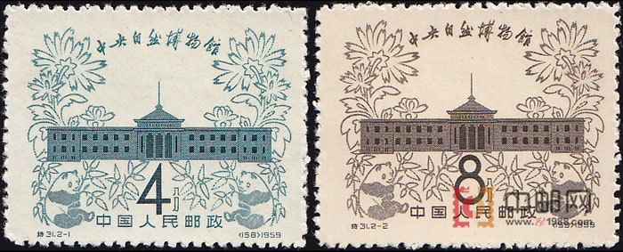 图案面值:1 中央自然博物馆 4 分 400 万枚 2 中央自然博物馆 8 分 800 万枚 邮票介绍:为了进一步发展我国的生物科学,普及和宣传推广生物学的知识,我国于1958年动工兴建了中央自然博物馆。该馆位于北京市崇文区天桥大街东侧。匾额为当时的中国科学院院长郭沫若所题。馆内共4个陈列室:植物陈列室,动物陈列室,古动物陈列室与古人类陈列室。邮电部发行的这套特种邮票共两种,图案均为中央自然博物馆外景。