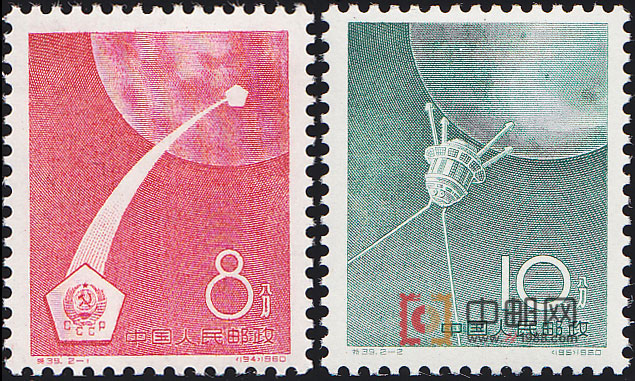 图案面值: 1 月球火箭 8 分 1000 万枚 2 行星际站 10 分 300 万枚 邮票介绍: 1959年,苏联相继成功地发射了月球火箭和行星际站,实现了人类第一次从一个星球到另一个星球的飞行,把一个自动行星际站送上了预定的轨道。这是人类空间科学上的重大突破,我国邮电部为此发行了这套特种邮票,以示祝贺。第1图为月球火箭,第2图为行星际站。