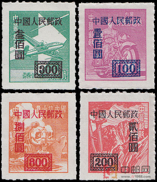这套邮票于1950年8月1日发行,原票为“中华邮政香港亚洲版单位邮票”。国民党政府1948年8月发行“金圆券”,行用不到10个月,银圆虽未明令为通货本位,但实已取代“金圆券”。邮资随物价飞涨而大幅度上升, 印刷高面值邮票也无法适应需要。1949年,中华邮政只得发行无面值单位邮票以供急需,各类邮件的资费均以银圆为基数,发售邮局按当日银圆牌价折合金圆券后售用。