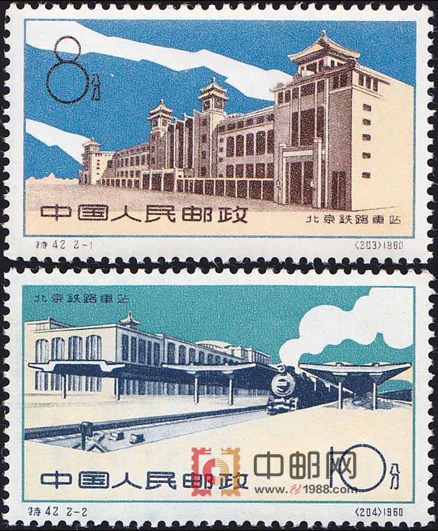 2-1为“车站正面”,票面是北京车站大楼正面全景,在蓝天白云下,大楼巍峨矗立,显得庄严华丽。