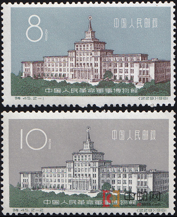 中国人民革命军事博物馆座落在北京海淀区复兴路玉渊潭公园南侧,1960年8月1日正式开放。主楼7层,一层为中央大厅,东侧为各个战争馆,有文物、图片共5000多件,西侧为“综合馆”和“保卫社会主义革命和社会主义建设馆”,展示了人民武装力量在新的历史时期的重大作用。中央大厅外广场,陈列着在历次革命战争中使用过和缴获敌人的武器。整个博物馆,展示了人民军队的光辉足迹,在博物馆开馆1周年之际,邮电部发行了这套特种邮票,2幅画面均为该馆平视图。