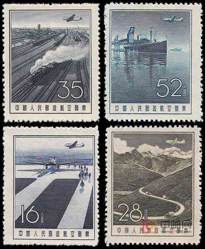 1955年3月1日,国家实行币制改革,发行新人民币。“航1”已不能再继续使用,为此,发行了这套新币值的航空邮票。全套4种,主图和面值分别为飞机场16分、公路汽车28分、火车35分、轮船52分。