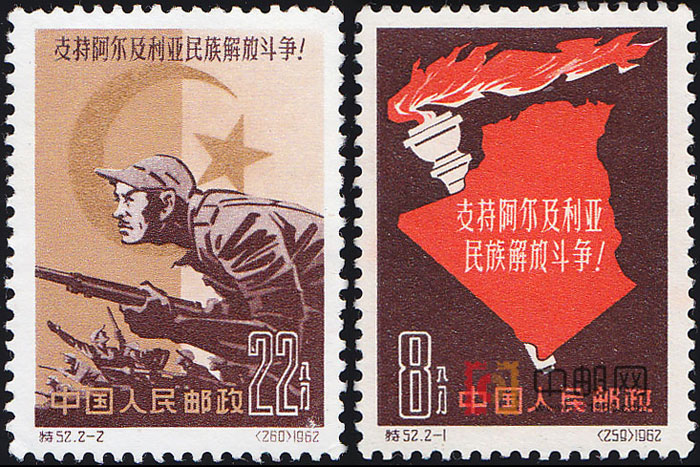 为了纪念阿尔及利亚独立,中国邮电部于1962年7月10日发行了这套邮票。