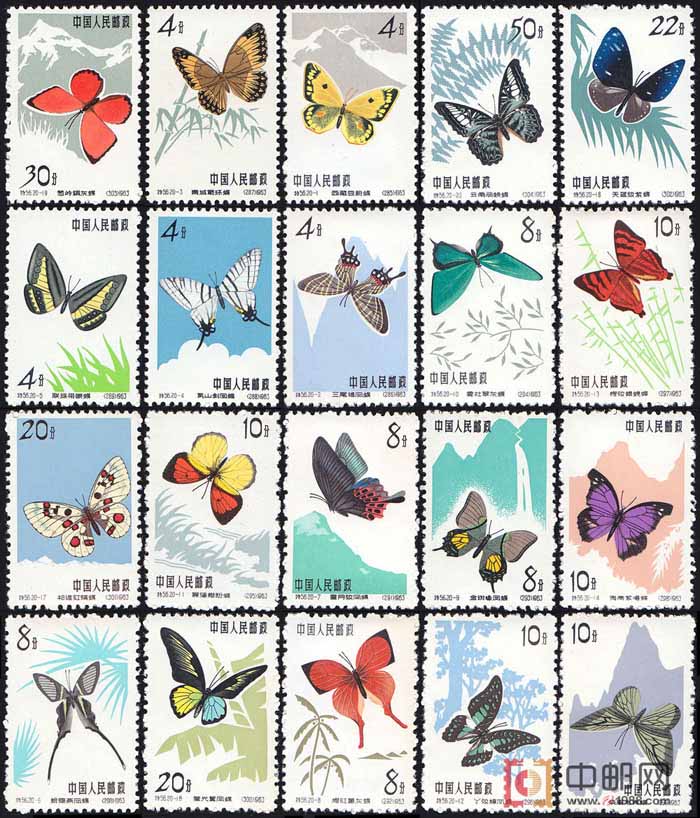 我国是蝴蝶资源最为丰富,种类较多的国家之一。蝴蝶不仅具有美学价值,而且是现代遗传学和生态学的重要科研资产。邮电部发行的这套《蝴蝶》特种邮票,20幅画面均是我国蝴蝶资源中的独有品种或世界珍稀品种。设计者在描绘它们各自的体型、结构、花纹、色彩、飞翔规律的同时,又把代表它们各自的主要产地和象征它们生活习性的树林、小溪、高山、瀑布等作为衬景,从而,加深了人们的印象,强化了艺术宣传效果。