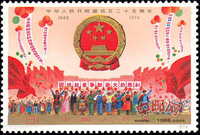 全套共1枚,为“团结起来,争取更大的胜利”。主图由中华人民共和国国徽和全国各族人民群像构成,象征着中国人民决心团结一致,争取建设祖国的更大胜利。