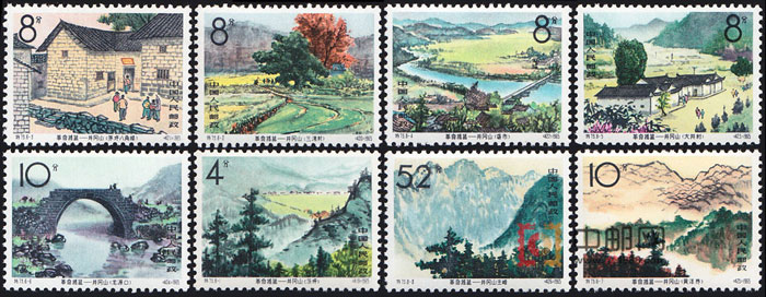 冈山位于罗霄山脉中段,迤逶连绵800余里,山势险要,粮食、特产丰富,具有开展革命斗争的有利条件。井冈山的斗争为中国革命开辟了一条以农村包围城市,最后夺取城市的正确道路,它的光辉业绩将永载人民革命斗争史册。为此,在中国共产党成立44周年之际。邮电部发行了这套特种邮票。图1-8分别为茨坪、三湾村、茅坪八角楼、砻市、大井村、龙源口、黄洋界、井冈山主峰。