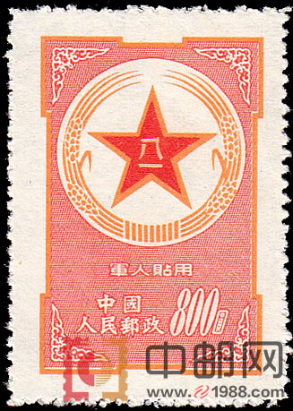 1953年2月为了优待军人寄信,邮电部发行一套“军人贴用”邮票,邮票共3枚,面值均为旧人民币800元,图案为中国人民解放军“八·一”军徽,军徽下面印有“军人贴用”、“中国人民邮政”、“800元”字样。第一枚底纹为橘红色,俗称“黄军邮”;第二枚紫色,俗称“紫军邮”;第三枚蓝色,俗称“蓝军邮”。图幅为21毫米×32毫米,齿孔14度,全张90(9×10)枚。胶版。由北京人民印刷厂营业分厂印制。拟于1953年8月1日发行。这套邮票于1953年7月初开始印制,是新中国第一套军用邮票。邮票分批印完,陆续下发到各部队和军事机关,每位官兵每月可得到2枚用于通信。邮票下发后,有的部队反映,在没有信箱代号的情况下使用军人贴用邮票容易泄密,邮票使用范围和对象也难以控制等等,为此,有关部门决定“延期实行”,停止使用。后来,军队有关领导机关作出决定,没有下发的邮票全部销毁。但在个人手中的军人贴用邮票仍被使用。这三种邮票都流出一些,其中蓝色“军人贴用”邮票印成较晚,留存下来的数量最少,成为罕品,极为珍贵。