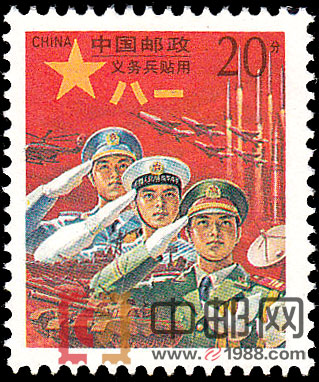 邮票围绕“神圣的使命”构思,构图以“八一”旗下陆海空三军仪仗兵战士行军礼形象为中心,突出义务兵的神圣使命,保卫社会主义祖国的光荣职责。因为主色为红色,人们习惯称它为“红军邮”。红军邮上,仪仗兵战士分别代表陆海空三军严整的军容和无敌的军威形象,模特写实的画法使三个年青人英俊雄健,朝气阳刚,代表了当代中国人的勃勃生机,背景以三军代表性的现代化兵器——主战坦克、导弹、驱逐舰,歼八战斗机、导弹直升机以及雷达、火箭等组成的诸兵种协同演习,展示了我国国防现代化及军事防卫的威慑力和综合国力的强大。和平鸽既有通信特点,又代表着和平的中国永远不会恃强凌弱,永远也不能被人欺负。加上右上角的20分字样,使整个画面既有强烈的统一,又显气势壮观。至1996年7月20日 ,沈阳军区司令部发出通知,内称:“根据总参通信部通知,‘义务兵专用邮票'的试点工作还要进行,但由于‘义务兵专用邮票'尚未发到军区,为保证广大义务兵免费邮寄信件的需要,从1996年8月1日起,驻东北三省的陆、海、空军及武警部队暂时恢复使用‘义务兵免费信件'三角形戳记”,“专用邮票”也再未发放。但这既不是试点工作的结束,也不是“义务兵专用邮票”的停用,而是“专用邮票”和“免费戳记”同时通用。