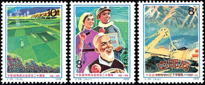 3-1为“建设新宁夏”。主图是一个回族老人和两位年轻人。姑娘头扎方巾身着蒙古袍,身边的男青年是一身矿工打扮,头带安全帽,系着白毛巾、手里捧着奖状。
