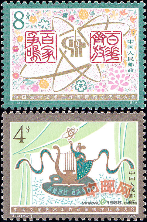 2-2为“百花齐放 百家争鸣”。画面主图是篆刻的“百花齐放”、“百家争鸣”八个字,技法娴熟,被海外集邮专家称为是“一套体现了中国篆刻艺术的精美邮票”,背景图案为工农兵所使用的工具和鲜花万朵,象征了文艺为工农兵服务的毛泽东文艺方针,同时也渲染出节日气氛。